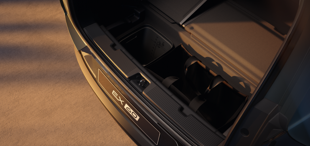 Volvo EX60 har lasterom på 1647 liter. Med praktisk oppbevaring kan du pakke med deg stort og smått. Bagasjerommet er på 523 liter, men legger du ned setene får du 1647 liter. I bilens frunk er beskyttet under panseret og er på 58 liter.