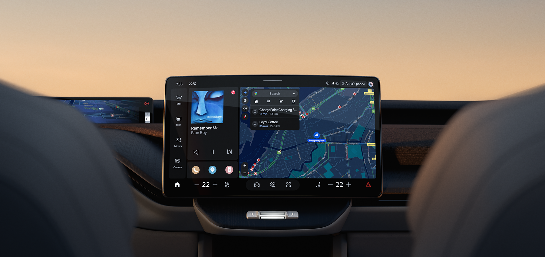 Innvendig byr EX60 på et stilrent, funksjonelt og luftig interiør basert på Volvos designfilosofi. Den store, tablet-stil touchscreen-skjermen gir intuitiv kontroll over infotainment og bilens funksjoner, mens materialvalg og romløsning gir komfort for alle i kupeen. Trådløse oppdateringer holder bilen oppdatert over tid.